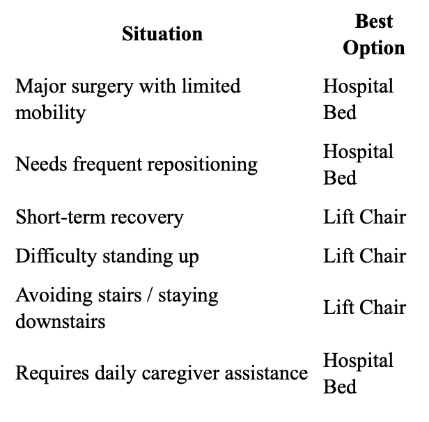 Choosing the right equipment can significantly impact recovery time, comfort, and safety. A hospital bed is best for patients who need medical support and spend extended time lying down, while a lift chair is ideal for those who remain mobile but need assistance with standing and sitting.